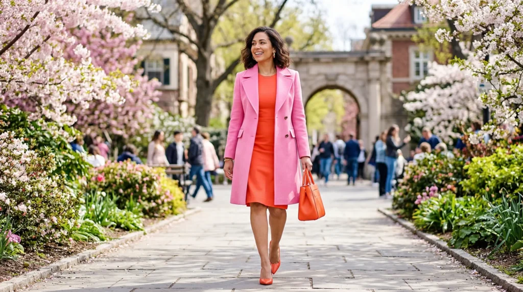 Color-blocking is back and it’s unapologetically bright. A coral-orange sheath dress paired with a bubblegum pink coat is the kind of combination that doesn’t just walk into a room. It glides. Add a structured orange bag and matching pumps, and suddenly you’re not just dressed for spring. You are spring.