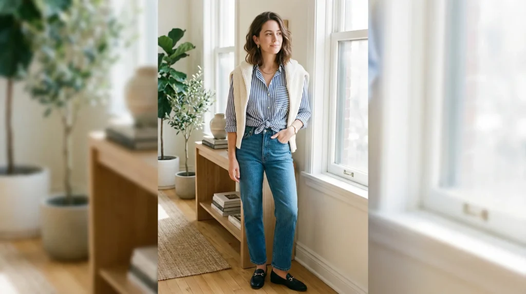 | The Classic Reimagined | Striped shirt, jeans, loafers, knit | Remote, business casual |