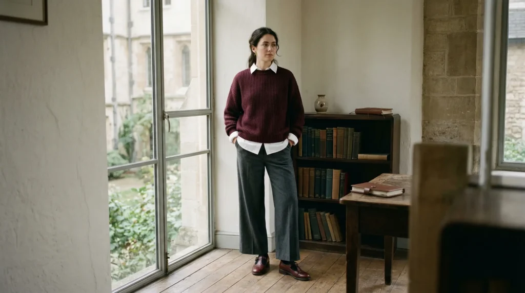 There’s something irresistibly grounded about a deep burgundy sweater layered over a crisp white shirt. It’s academic, yes, but also quietly bold in the best possible way. The loose fit of the sweater softens the vibe while the structured white collar peeking through keeps the look firmly office-ready. Wide-leg charcoal trousers add movement, and oxblood Mary Janes bring a whisper of vintage.