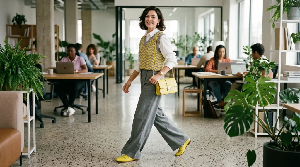 Can we talk about this color combination? Lemon yellow and soft gray might just be the best new work pairing for spring 2026. A graphic chevron sweater vest instantly catches the eye, especially layered over a classic white button-down. Structured gray wide-leg trousers give a tailored foundation, while lemon loafers and a matching handbag playfully echo the yellow. Tonal coordination, but make it genuinely fun.