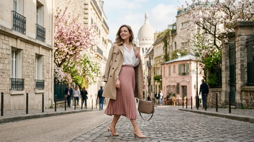 | Parisian Spring Blush | Blush skirt, white blouse, trench coat | Corporate, networking |