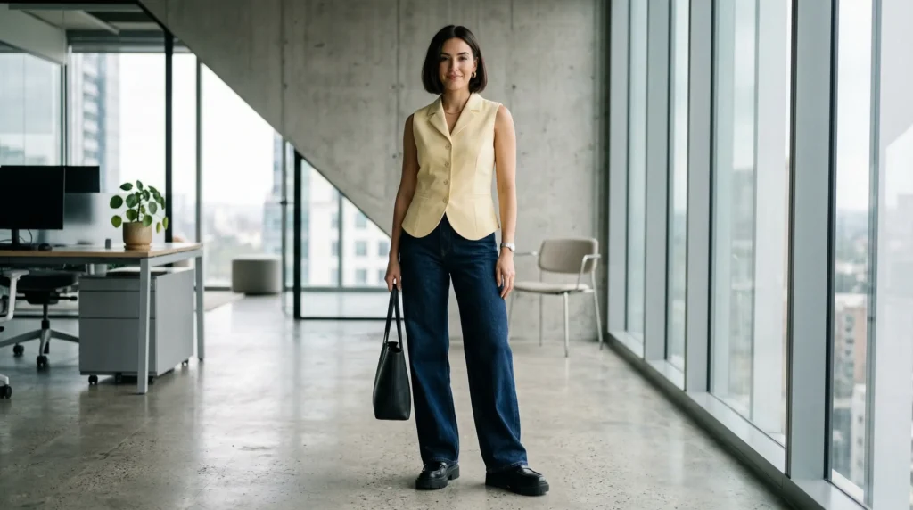 | Sleeveless Sharpness | Yellow vest, wide-leg dark jeans, loafers | Creative, modern office |
