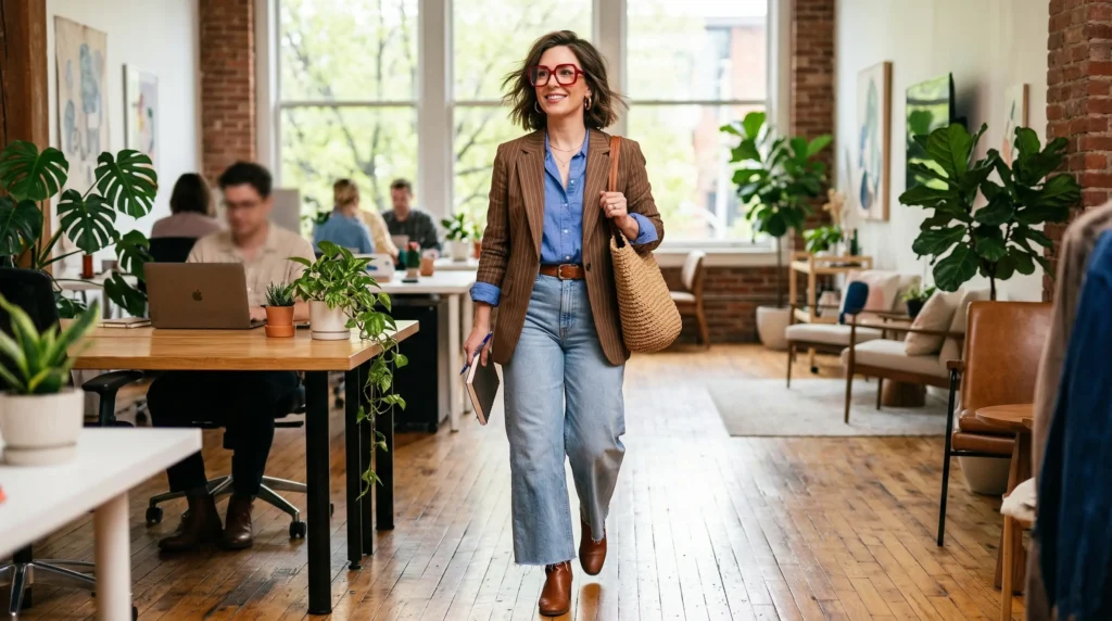 This outfit speaks softly but carries a serious vibe. A brown pinstriped blazer brings immediate structure and polish, layered over a cornflower blue blouse that softens the whole look. Light-wash wide-leg jeans are the surprise twist that makes everything feel wearable, approachable, and very now. Oversized red glasses and a woven tote complete the throwback-meets-modern boss energy.