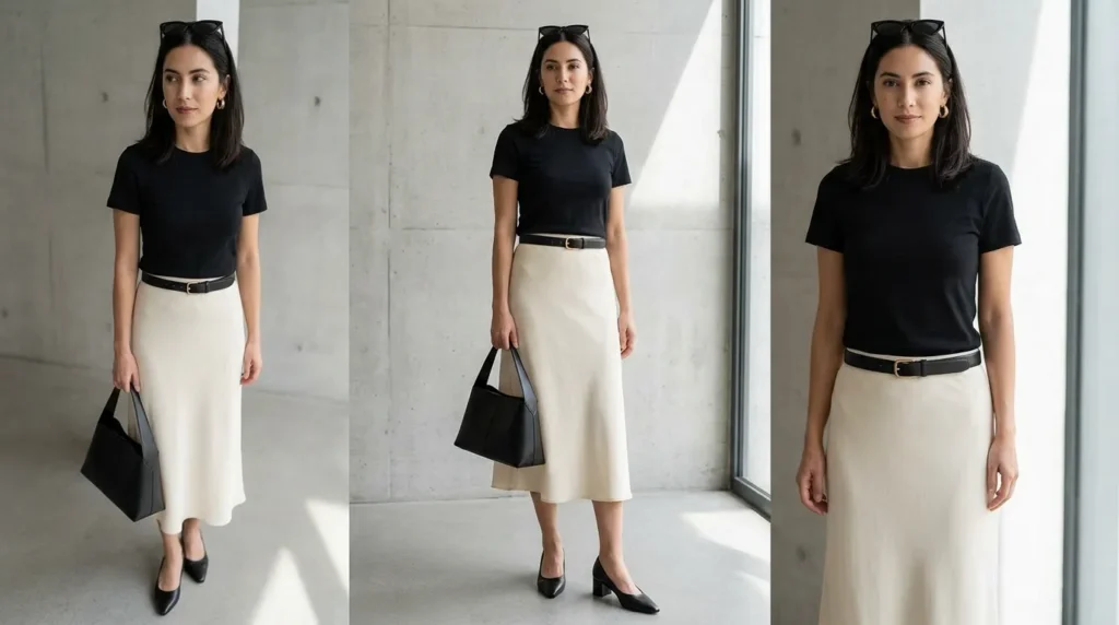 Black Tee + Cream Midi SkirtEveryday minimalismGraphic tee, high-slit skirt, gold hoopsModern contrast