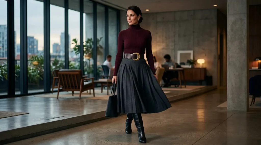 This last outfit is the one that stops the scroll. A burgundy turtleneck paired with a full gray midi skirt and leather boots — it’s fall personified. Rich, deep, full of character. Now here’s where it gets interesting: the colors are bold, but the silhouette is clean. That’s the key to making this work in an office.