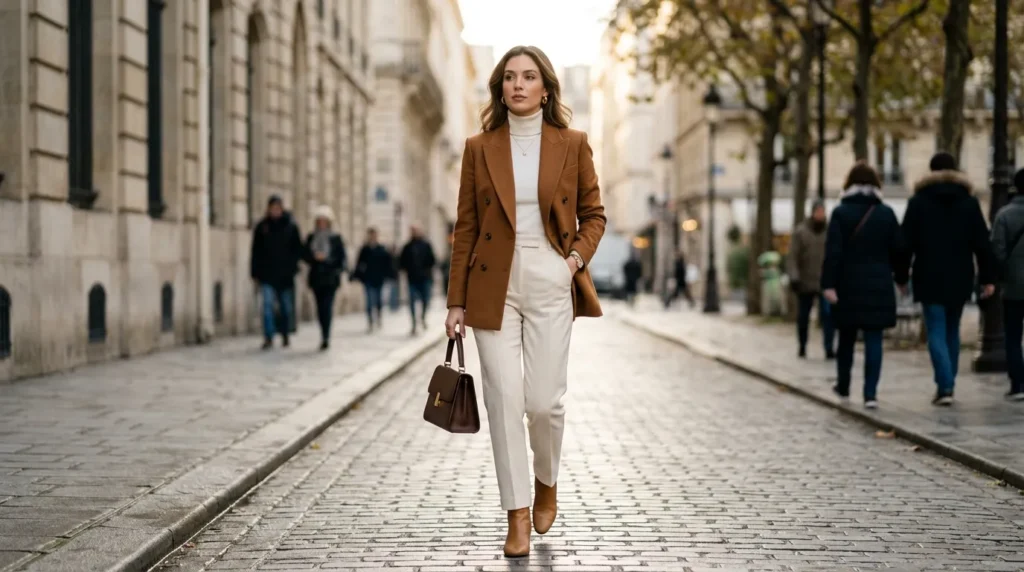 Brown is the new black in 2026 — and this outfit is the proof. A caramel double-breasted blazer, a white turtleneck underneath, and tailored ivory pants — it’s a combination of elegance and tonal unity that looks effortless but is incredibly well thought-out. Perfect for cold mornings when you want warmth and style at the same time.