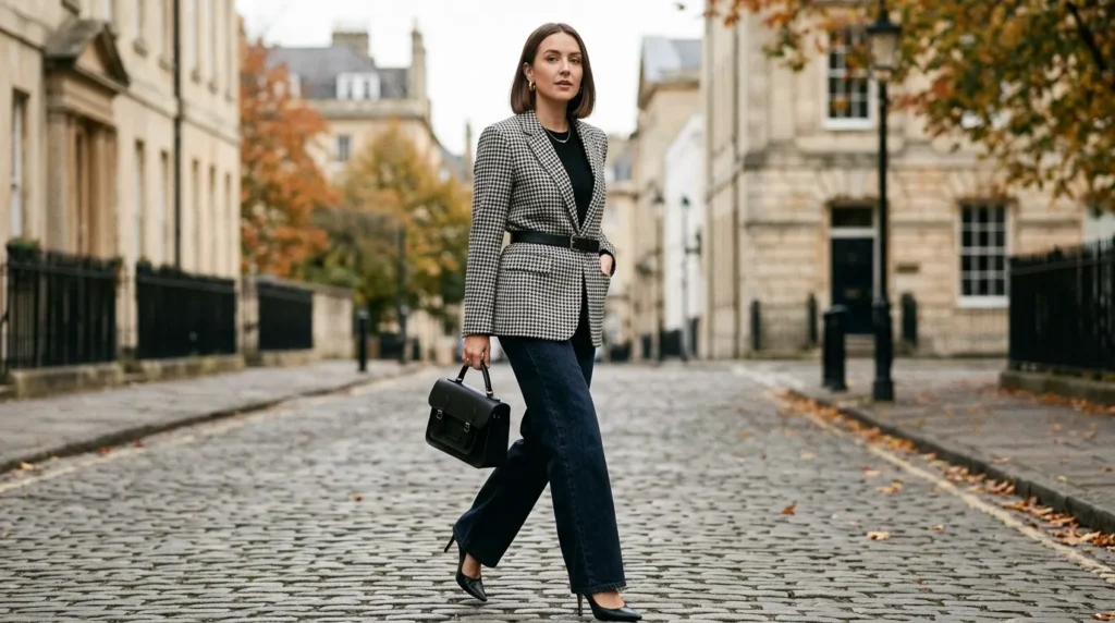 Houndstooth Blazer + Wide-leg JeansIn-between seasonsCheck blazer, black top, pointed heelsHeritage modern