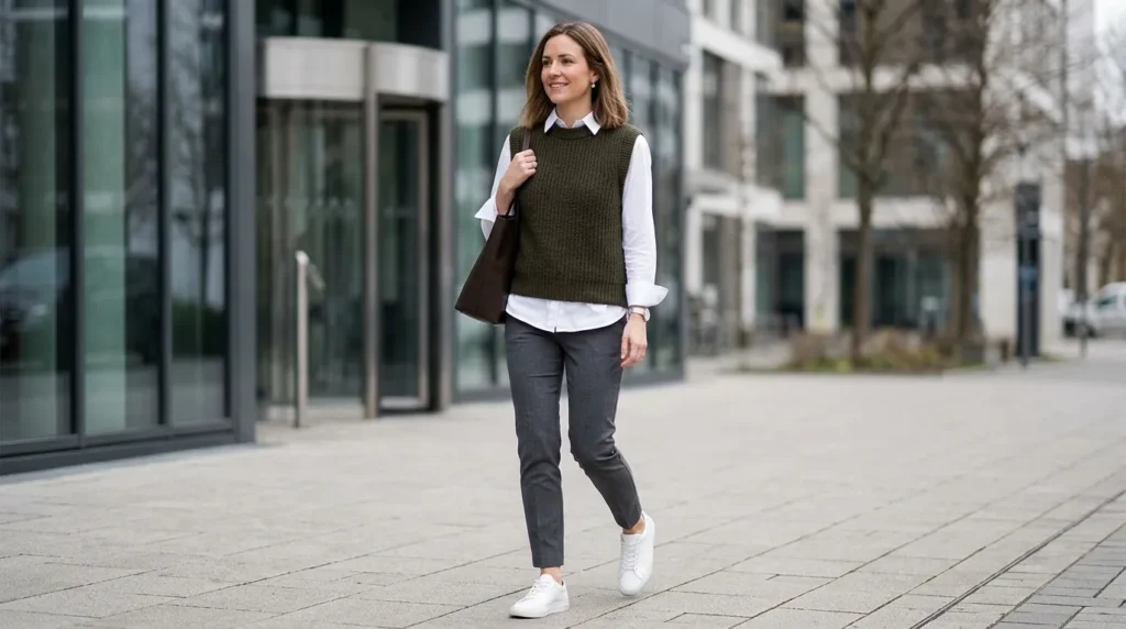 Knit Vest + White ShirtTransitional seasonsKnit vest, tailored trousers, sneakersSmart layering