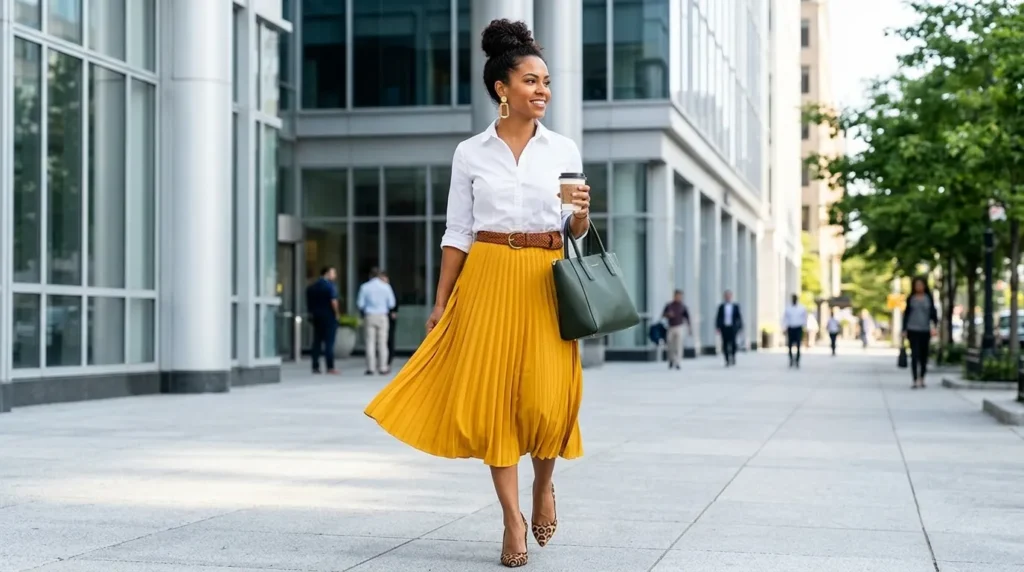 Nothing says “I’m ready for this Monday” quite like a mustard pleated skirt peeking out under a fresh white shirt. The way the fabric moves, the way it catches light — it’s practically a style mood board come to life. Now here’s where it gets interesting: this isn’t a retro throwback, it’s a very 2026 take on color and structure.