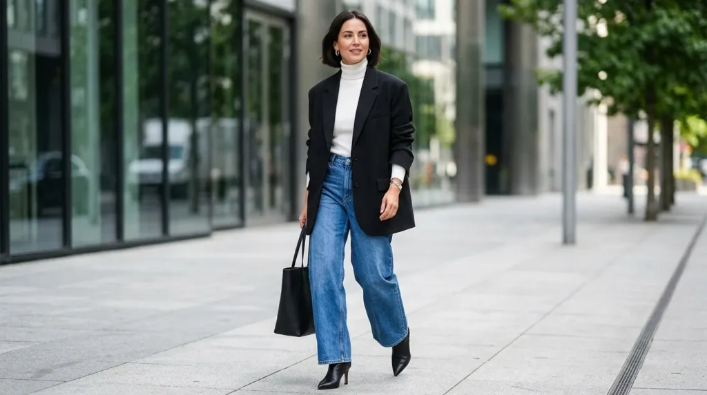 Honestly, if I had to pick one outfit to represent casual office outfits for work 2026, this might be it. A big black blazer over a white turtleneck, paired with wide-leg jeans — it’s professional, comfortable, and effortlessly cool all at once. It’s the uniform of the modern multitasker.