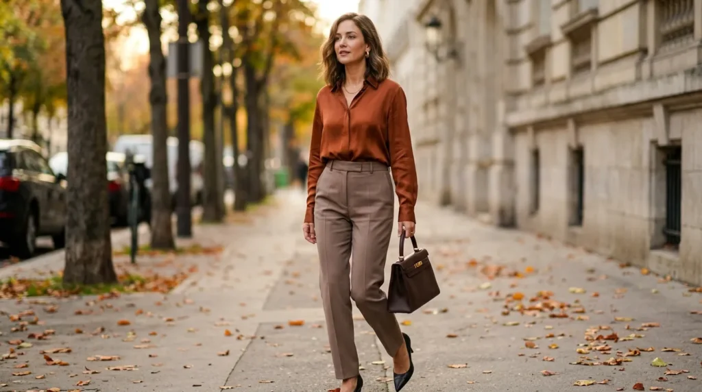 Few things are as quietly elegant as a rust-colored silk blouse paired with taupe tailored trousers. It’s golden-hour dressing applied to a work outfit — soft, flattering, and timeless. Earthy tones have always had a certain calm power to them, and this color scheme is no exception.