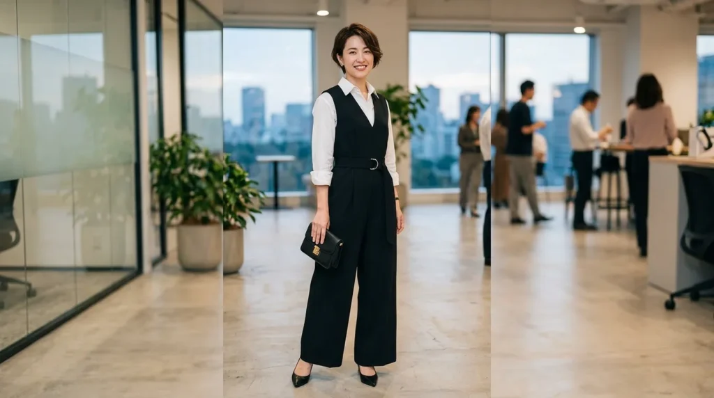 Tailoring continues to be a major trend in casual office outfits for work 2026, and this black sleeveless jumpsuit layered over a white shirt is a fresh spin on the classic suit. It’s organized but easy-going, professional but still feminine. The belted waist keeps it intentional, and the rolled-up sleeves make it feel relaxed enough for creative offices or casual Fridays.