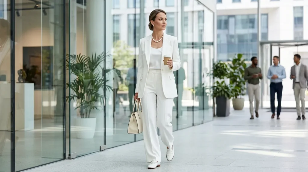 What keeps it from feeling stiff? The wide-leg trousers give you room to move, the shoulders are tailored but not boxy, and softening it with pearls brings in grace without losing authority. You might be wondering if all-white is too precious for a real office day — don’t overthink it. Swap the heels for loafers and you’ve got a look that goes from presentation to coffee run in seconds.