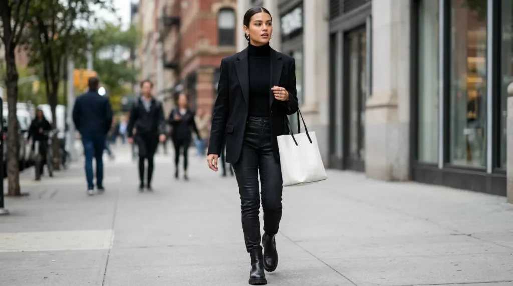 Black-on-black never gets old, but in 2026 the difference is in the texture. A tailored blazer over a fitted knit top with slim black jeans creates interest through contrast — matte versus slight sheen, structure versus softness.
