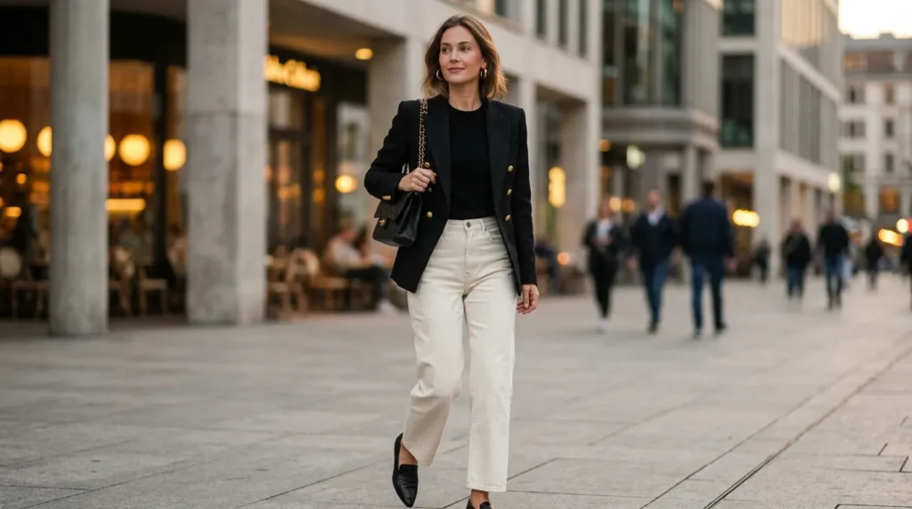 If you want one outfit that covers every base — work, weekend, evenings out — this is it. A structured black blazer with gold buttons, cream high-waisted jeans, gold hoop earrings, and a quilted leather bag. It’s sharp. It’s timeless. It’s the definition of smart casual power dressing 2026.