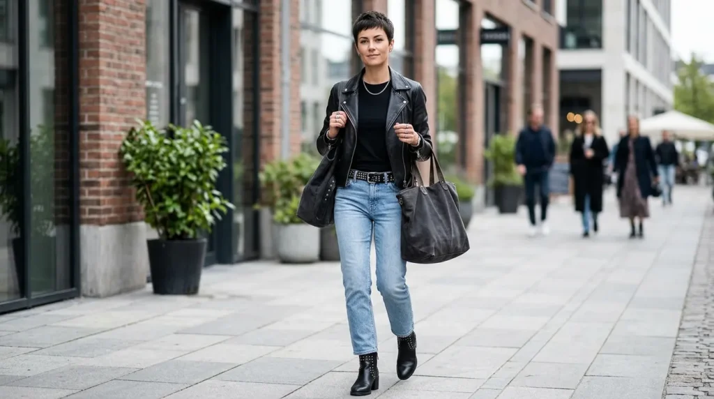 Studded ankle boots and a matching belt add that rebellious heartbeat the look needs. An oversized tote keeps it functional. This is grown-up women’s street style — confident, grounded, and completely in control.