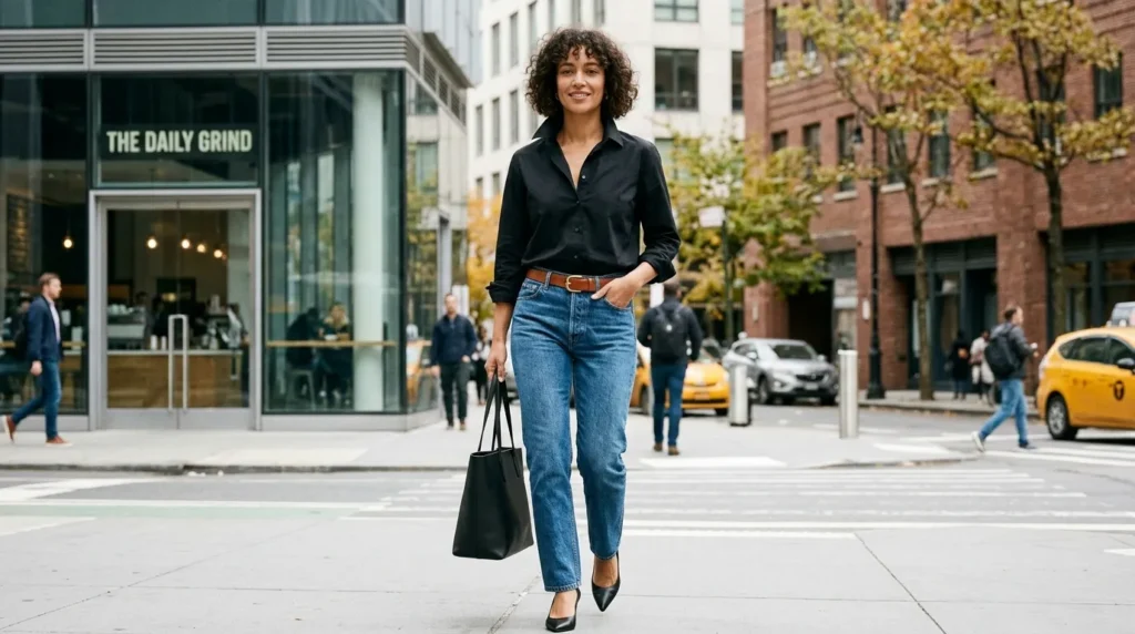 Let’s start with the look that never actually goes out of style but always finds a way to feel fresh. A crisp black button-down shirt tucked halfway into straight-leg blue jeans is, without question, one of the strongest casual outfits for women 2026 you can build.