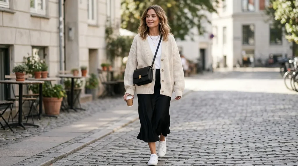 Here’s a combination that’s been showing up everywhere on the streets of Copenhagen, Seoul, and New York: a ribbed cream cardigan over a white tee, with a flowing black midi skirt. The contrast between the cozy knit and the silky skirt fabric creates a texture play that looks expensive without costing a fortune.