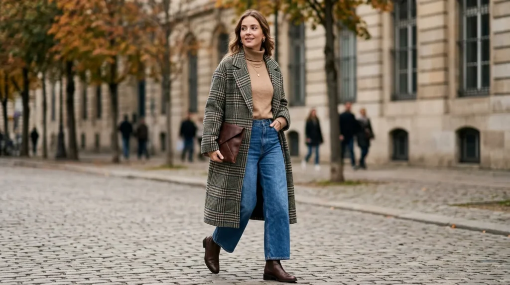 Fall 2026 casual fashion trends are all about bringing classic patterns back in wearable, modern ways. A checkered oversized coat worn over a beige turtleneck and wide-leg denim is the kind of look that feels both timeless and completely current.