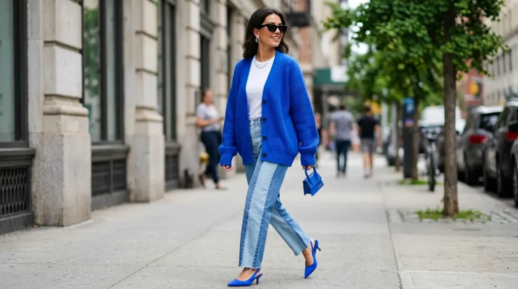 Not every casual street style 2026 look needs to be neutral. This one proves that color still has a place — a big, confident place. A cobalt blue oversized cardigan paired with two-tone jeans makes a statement that’s bold without being overwhelming.