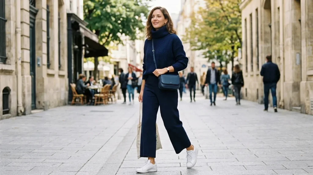 Monochrome dressing is one of those 2026 street style trends that looks intimidating until you try it — and then you can’t stop. This look pairs a high turtleneck navy sweater with cropped wide-leg navy pants and white sneakers to break the tone just enough.