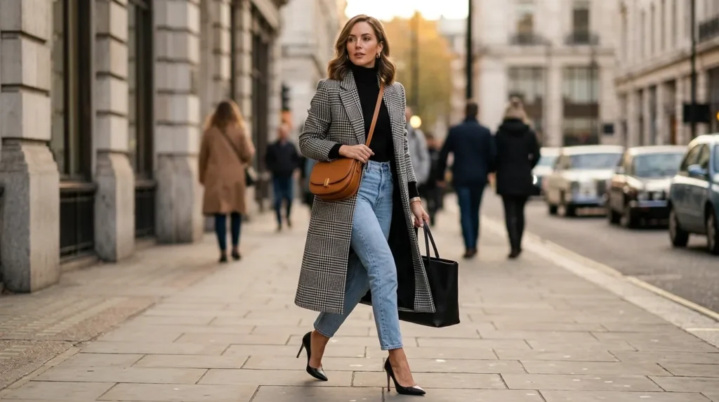 A long houndstooth coat is one of those wardrobe investment pieces that never stops giving. Pair it with a black turtleneck and light-wash jeans, and you’ve got a look that balances polish and ease perfectly. Pointed heels elongate the silhouette, and a caramel crossbody bag adds a sophisticated finish.