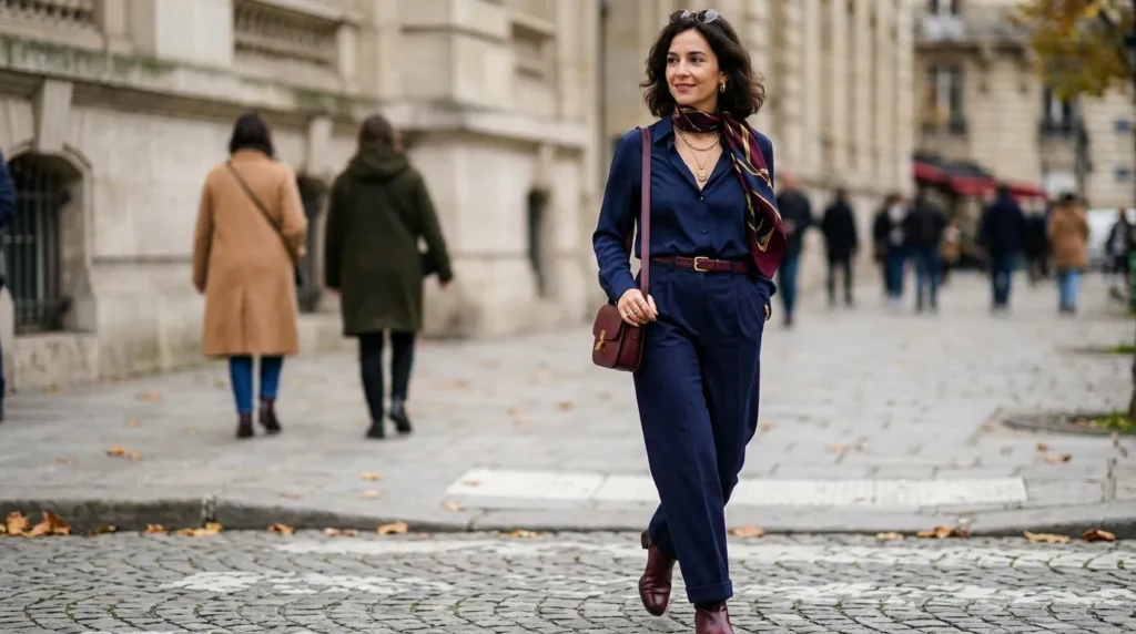 Pair wide-leg navy trousers with a tucked-in navy shirt, then bring in burgundy through accessories — a bag, boots, or a scarf. The result feels vintage and modern at the same time. Gold jewelry keeps it from feeling too dark or heavy.