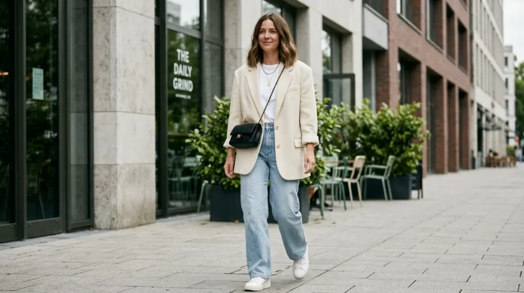Wide-leg jeans, a white top, and an oversized cream blazer. If you’ve ever wanted an outfit that looks like you tried without trying, this is it. The blazer does all the heavy lifting — it adds structure, sophistication, and that quiet sense of smart casual style that’s everywhere in 2026.
