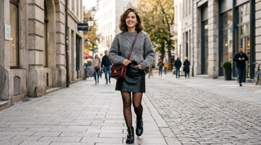 Here’s one for the days when you want to feel both cozy and fun. An oversized gray knit sweater paired with a mini skirt and sheer dotted tights is pure casual chic fashion — youthful, textured, and completely wearable on a cold city morning.
