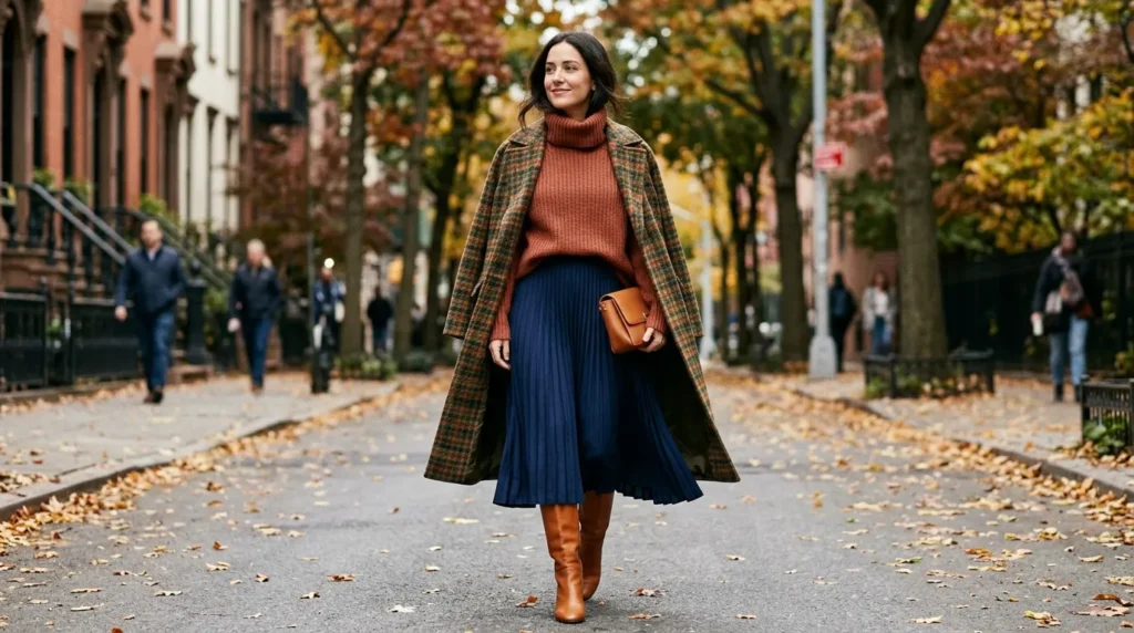 This is one of the most visually interesting casual outfits for women 2026 street style trends of the season. A loose terracotta turtleneck worn under a navy pleated midi dress, layered under a long checkered coat — it sounds like a lot, but it works beautifully.