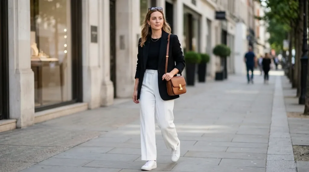 This one’s for the minimalism lovers. A black blazer, white wide-leg pants, a black top underneath, and white sneakers — it’s as clean and intentional as it gets. A warm saddle-brown shoulder bag keeps it from feeling too stark.