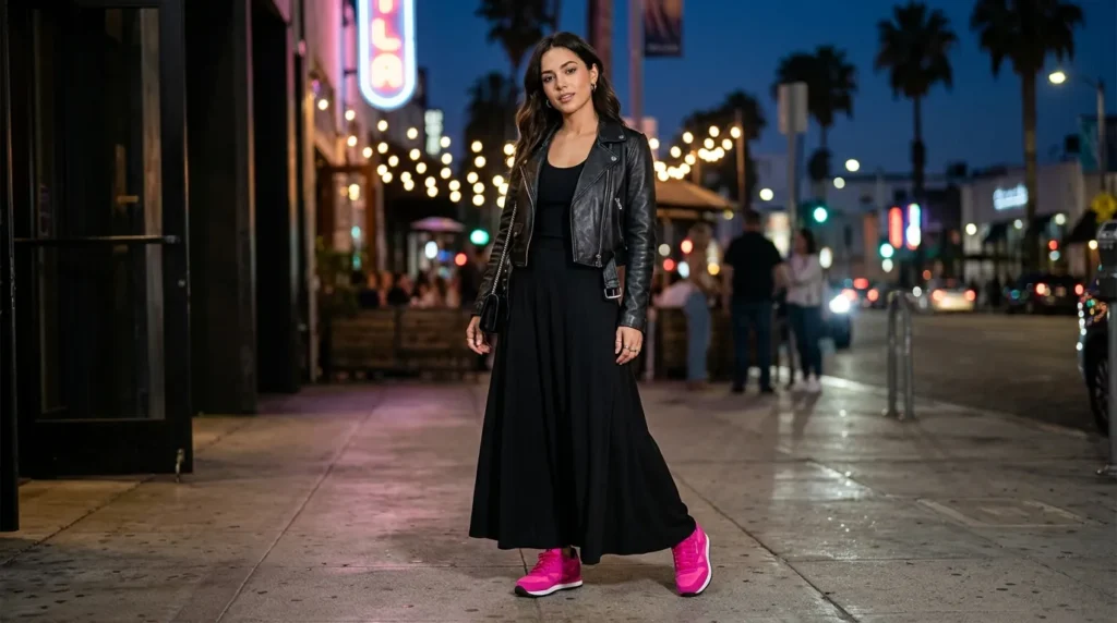 Sneakers for a night out? Absolutely — especially when you pair them with a dramatic black maxi skirt. Add a cropped leather jacket and bright pink sneakers, and you’ve got a look that’s unexpected, bold, and very 2026.