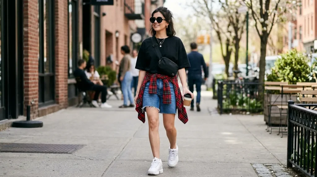 A boxy black tee, denim shorts with a raw hem, chunky white sneakers, and a belt bag worn crossbody — this is the warm-weather casual sneaker look you’ll reach for every weekend.