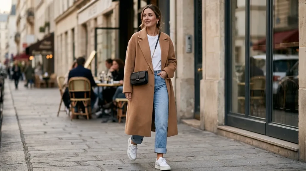 A camel coat with sneakers is genuinely one of the best style combinations of 2026. The juxtaposition is everything: polished outerwear meets sporty footwear. Wear it with light-wash cuffed denim and a crisp white top underneath, and you’ve got a look that goes from brunch to city errands without missing a beat.