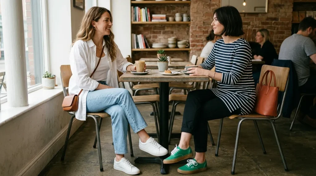Both feel relaxed, polished, and genuinely wearable. What pulls them together are the accessories: warm-toned bags, delicate jewelry, and shoes with a little personality. Those green sneakers, in particular, are exactly the kind of expressive footwear that defines 2026 style.