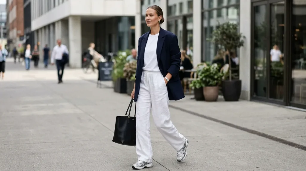 This look is for people who want to look refined and relaxed at the same time. An oversized navy blazer, loose white trousers, and vintage silver running shoes — it’s minimalist, sporty, and quietly cool.