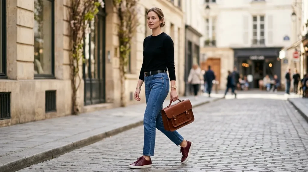 This is the understated power move of the list. A fitted black top, straight-leg mid-wash jeans, and burgundy sneakers — simple, clean, and quietly confident. The sneakers do all the talking without screaming for attention.