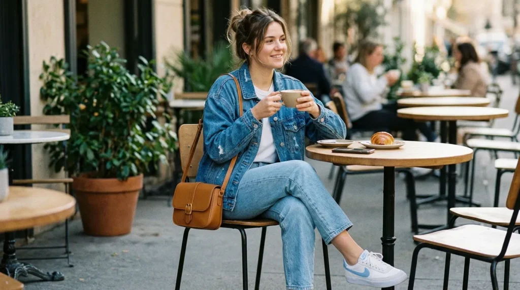 Double denim is back, and it’s never looked better. An oversized denim jacket over a white tee, paired with relaxed straight-leg jeans and white sneakers with pastel blue detail — it’s nostalgic, comfortable, and genuinely current.