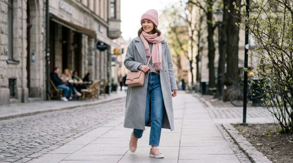 A long wool coat in soft grey, pink accessories — cap, scarf, sneakers — and easy denim underneath. It’s coordinated without being matchy, structured without being stiff.