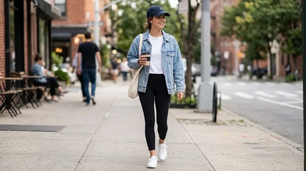 You might be wondering: can leggings actually look stylish? Yes — but the execution matters. An oversized denim jacket over a plain white tee, paired with fitted (not baggy) leggings and clean white sneakers, creates a look that’s casual but clearly thought-through.