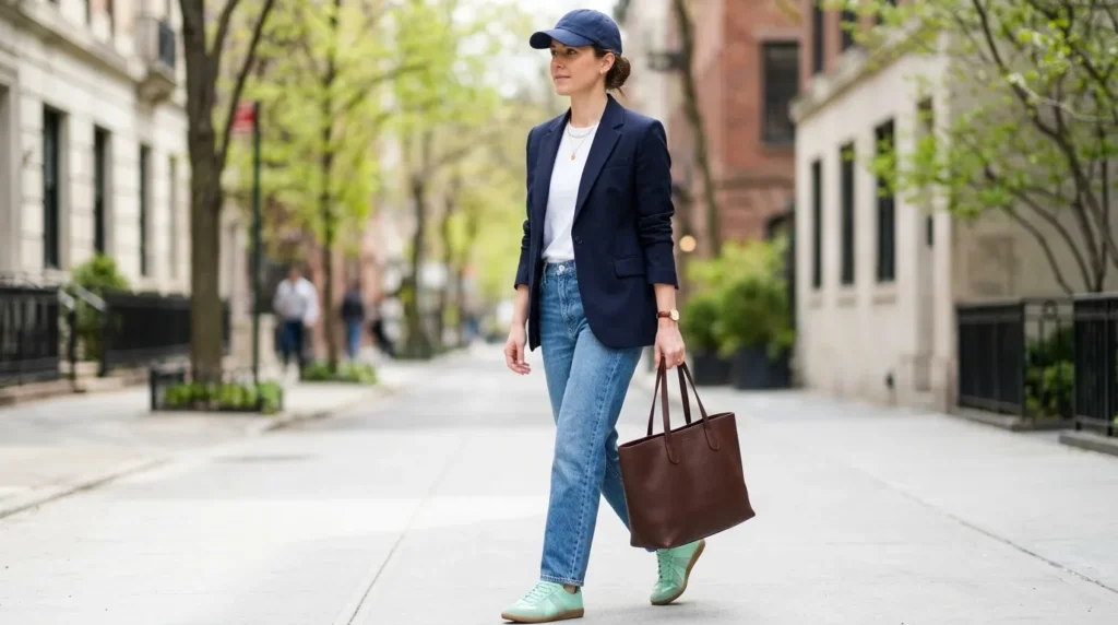 Here’s a combination that feels both professional and playful: a tailored blazer, relaxed denim, and mint green sneakers. The blazer adds immediate polish. The jeans keep it casual. And those mint sneakers? They’re the whole point.