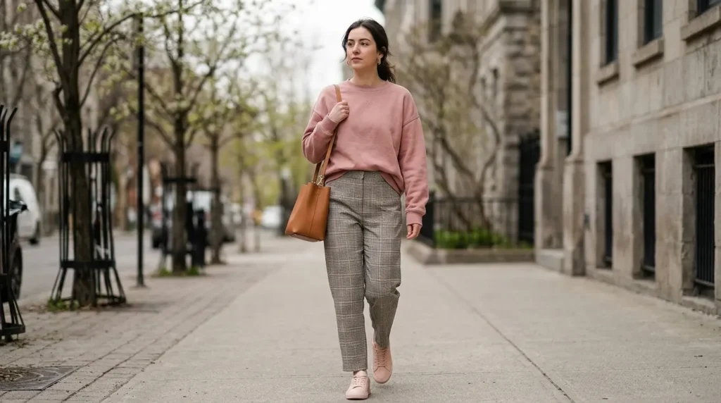 What I love about this look is how the pieces work both together and apart. The muted sweatshirt layers beautifully over outerwear when it’s cold. The checkered pants add structure without screaming “office.” And those blush sneakers? They add a pop of color without committing to anything loud.