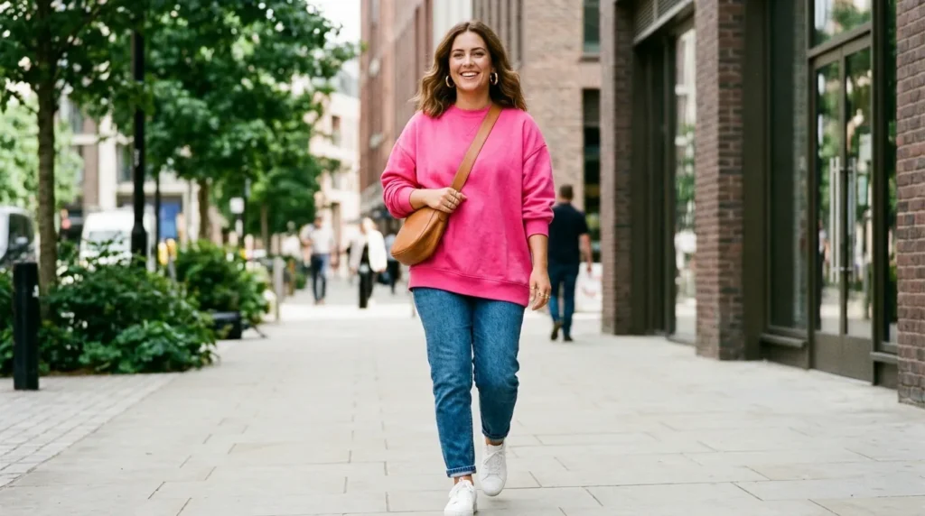Color has power — and an oversized bright pink sweatshirt proves it. Pair it with tapered denim and white sneakers, and the look is casual but deliberate. A warm crossbody bag balances the palette without competing with the statement top.