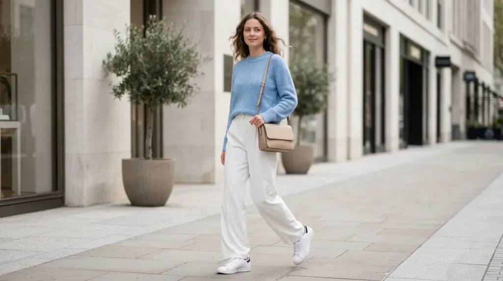 There’s something peaceful about cool blue tones with relaxed shapes. A soft blue knit sweater, wide-leg white trousers, and striped white-and-black sneakers make for a look that’s breezy, clean, and quietly stylish.