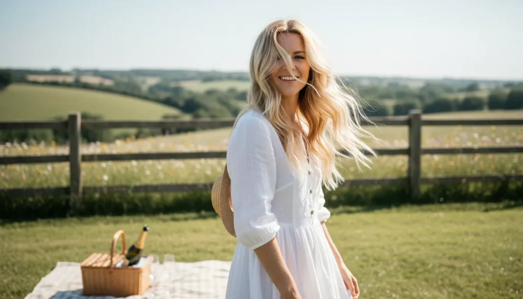There’s something so dreamy about champagne blonde hair in natural outdoor lighting. Those flowing waves paired with the soft champagne tone create this romantic, almost ethereal quality.
