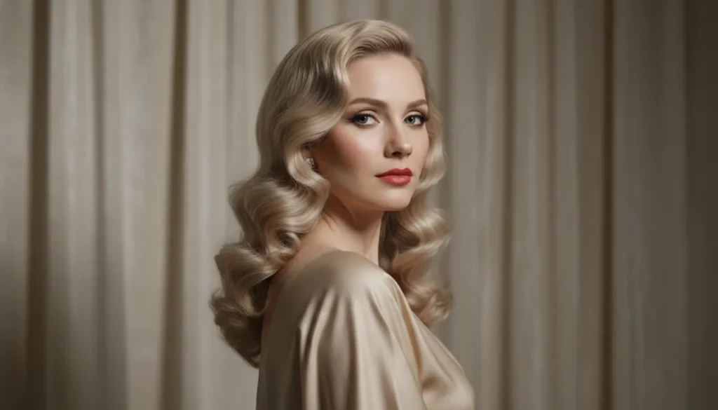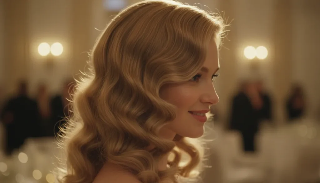 The champagne tone keeps it modern despite the vintage styling. If it were platinum or a warmer golden blonde, it might feel too dated. But champagne blonde hair has this contemporary quality that updates the classic waves perfectly.