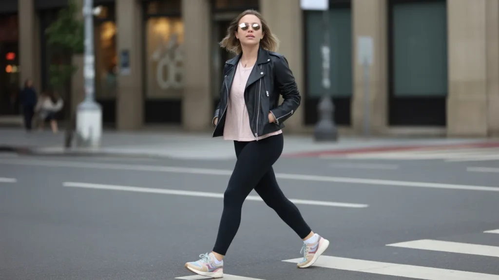 A cropped moto jacket over high-waisted black leggings is one of those combinations that just works every single time. It’s clean. It’s confident. And when you add a pair of mint-green or pastel sneakers? The whole thing comes alive without trying too hard.