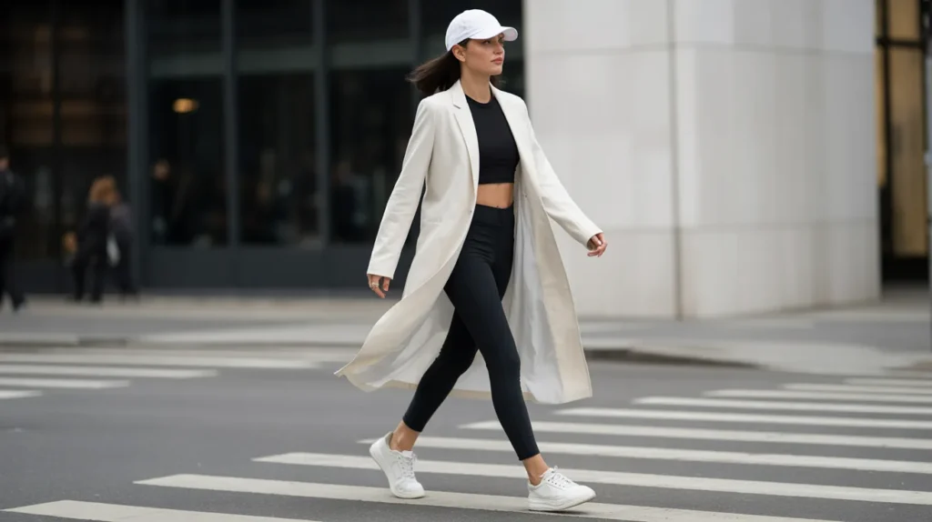 A white longline coat over a white crop top and black leggings, paired with matching white sneakers and a baseball cap — it’s crisp, it’s confident, and it moves beautifully. The structure of the coat brings the whole look into “intentional” territory while the cap and sneakers keep it real.