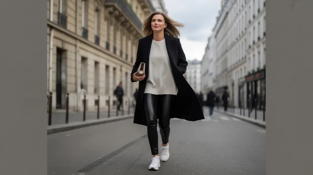A black structured coat over a loose cream sweater and leather-look leggings, finished with clean white sneakers — this is Parisian nonchalance without any of the pretension. It’s three textures (wool, knit, leather) working together in two colors. That’s the whole secret.