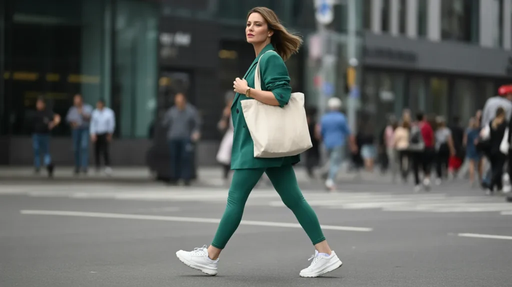 An oversized double-breasted blazer in muted green with matching leggings and bold white sneakers — this is athleisure meeting tailoring at the exact right intersection. The co-ord approach (matching top and bottom) creates that editorial pulled-together look that makes people think you planned for much longer than you did.